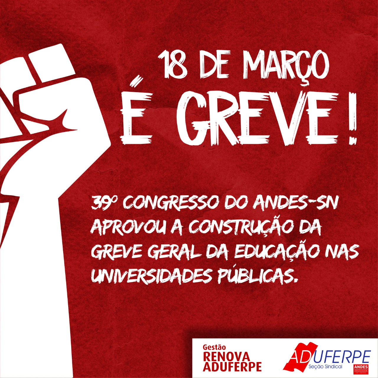 Aprovada no 39 Congresso do Andes-SN, realizada este mês entre os dias 4 e 8, em São Paulo, a Greve Geral da Educação nas Universidades Públicas será no dia 18 de Março.