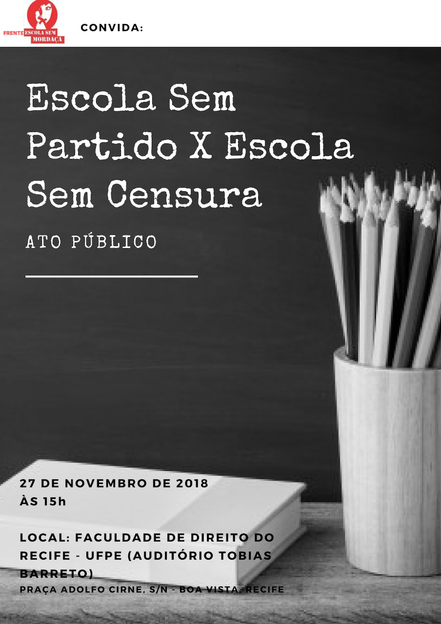 Por isso, foi deliberada a manutenção da realização do evento, agora com novo nome, Ato Público ESCOLA SEM PARTIDO VERSUS ESCOLA SEM CENSURA, e novo local, Auditório Tobias Barreto da Faculdade de Direito do Recife – FDR/UFPE, situada à Praça Adolfo Cirne, s/ nº, Boa Vista e para o mesmo dia anteriormente fixado, 27 de novembro de 2018, iniciando às 15h.