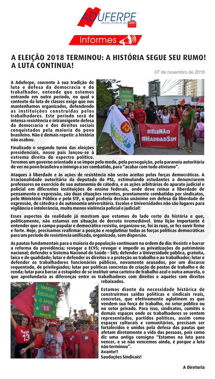 A ELEIÇÃO 2018 TERMINOU: A HISTÓRIA SEGUE SEU RUMO. A LUTA CONTINUA! Por Redação - 9 de novembro de 2018