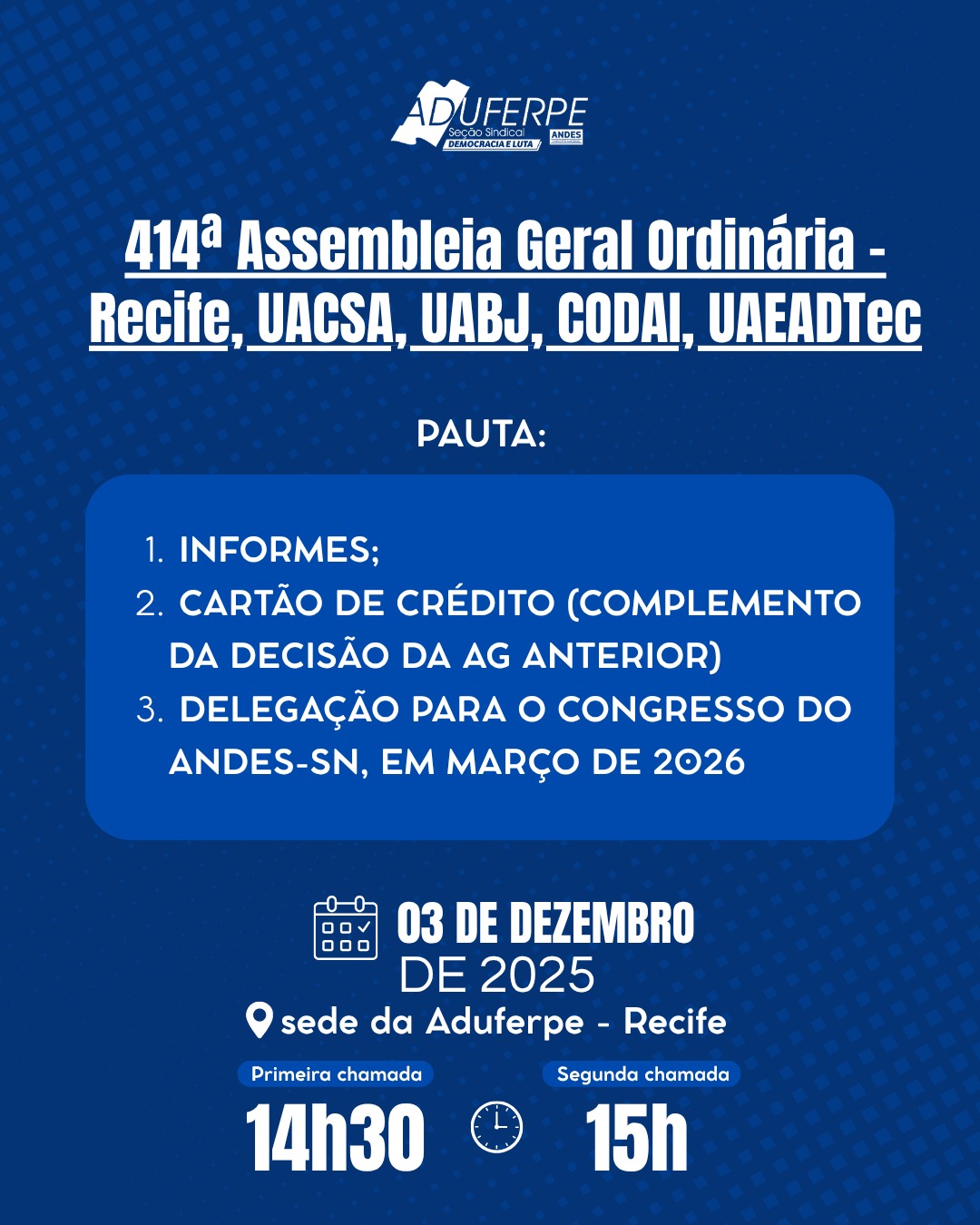📣 Convocação | 414ª Assembleia Geral Ordinária da Aduferpe | O Sindicato convoca docentes de Recife, UACSA, UABJ, CODAI e UAEADTec para participarem da 414ª Assembleia Geral Ordinária, espaço fundamental de debate e deliberação coletiva. Em pauta: informes, cartão de crédito (complemento da decisão da AG anterior) e definição da delegação para o Congresso do ANDES-SN – março de 2026.