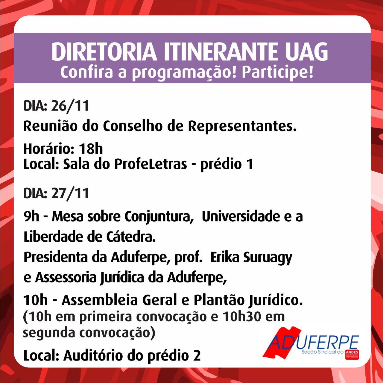 Se você é docente da UAG, fique ligado! Nesta segunda (26) e terça-feira (27) a Aduferpe estará presente na sua unidade com várias atividades e serviços, inclusive realizando a 369 Assembleia Geral Extraordinária. Confira os cards abaixo. Participe e chame os/as colegas!