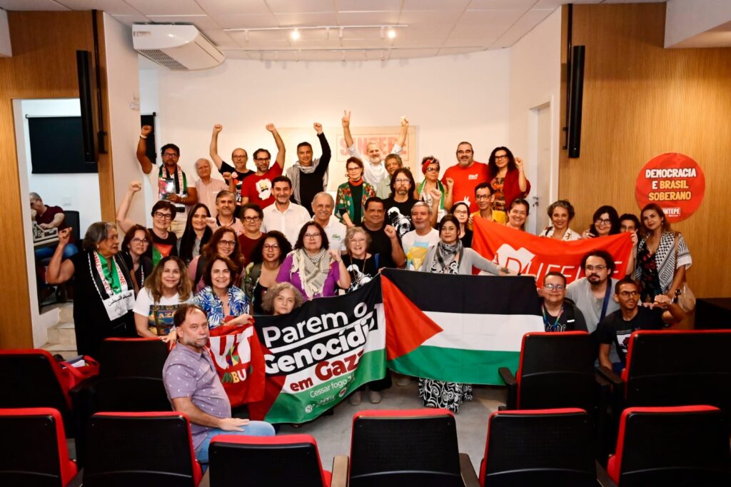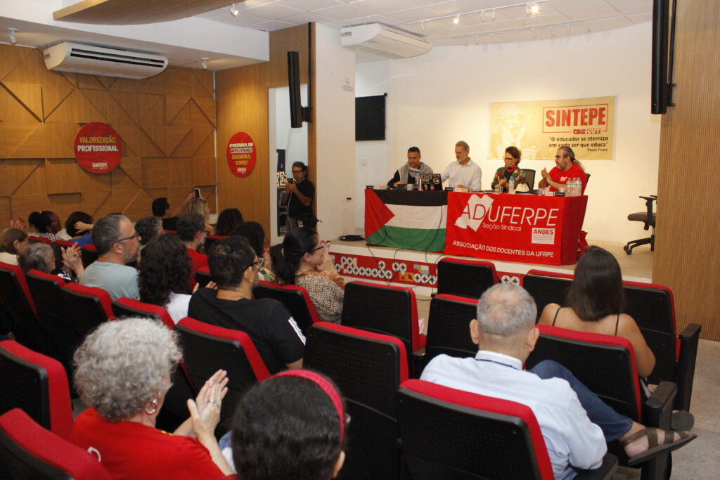 A nova etapa do genocídio do povo palestino pelo estado de Israel, que completa dois anos no próximo dia 7 de outubro, foi tema de um grande debate promovido pela Aduferpe na noite desta sexta-feira, dia 3, no auditório do Sintepe, parceiro da iniciativa. Com o auditório quase lotado, o debate trouxe ao Recife o presidente da Federação Árabe Palestina do Brasil (Fepal), Ualid Rabah, e o historiador e professor da Universidade Federal de Alagoas (Ufal), Pedro Vasconcellos. Também participou o advogado, ativista dos direitos humanos e professor da Universidade Católica de Pernambuco (Unicap), Manoel Moraes, e a antropóloga e psicanalista Vânia Fialho, UPFE, como mediadora.