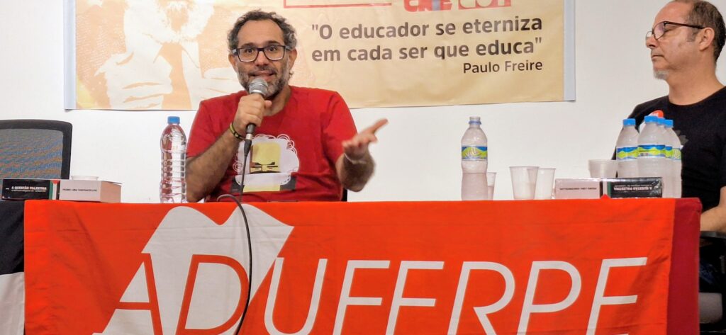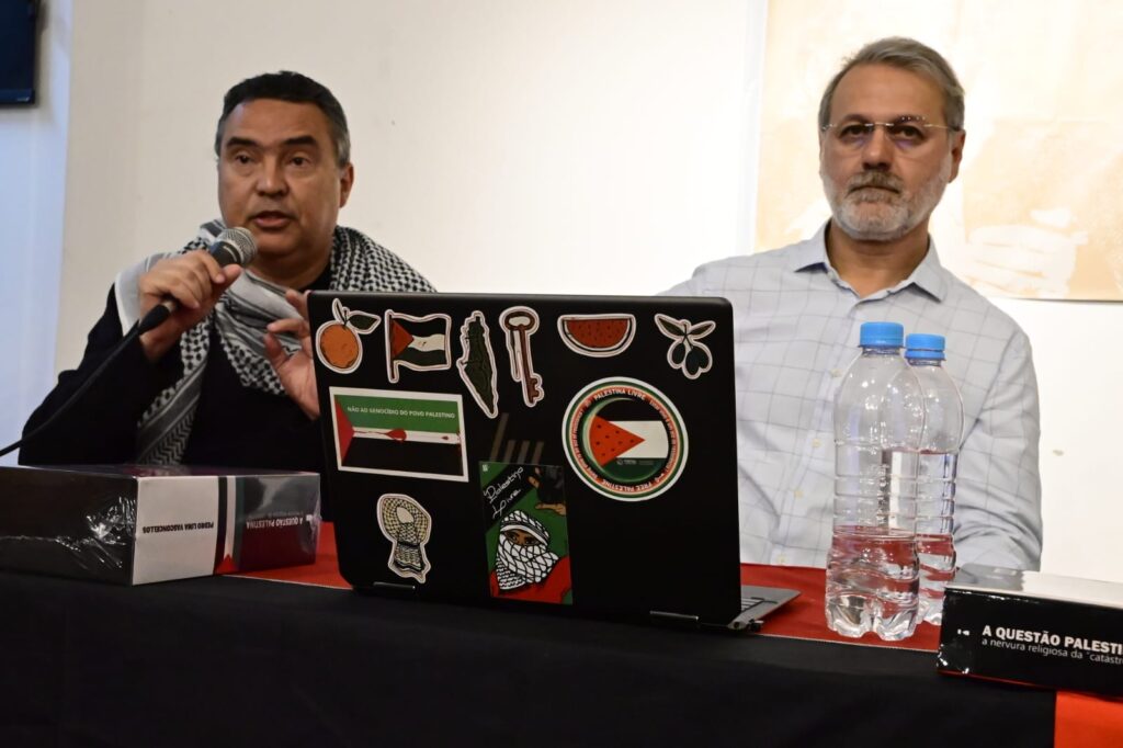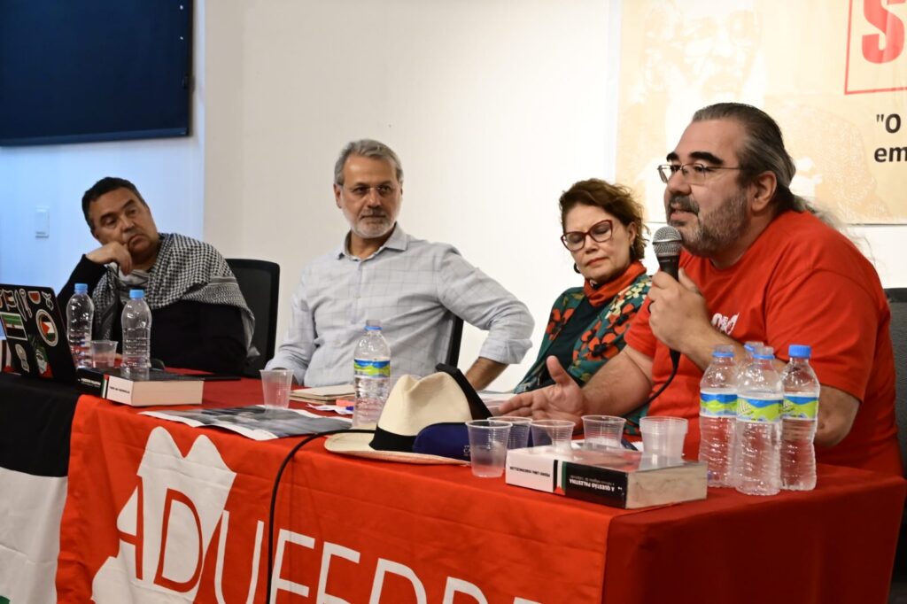 O historiador Pedro Vasconcellos analisou o processo histórico de consolidação do sionismo e da política de desterritorialização e invisibilização do povo palestino desde o XIX. Por fim, afirmou que a questão da Palestina representa uma ruptura, um marco divisor do nosso tempo. “É uma antecipação do que pode vir pela frente. “A depender do destino da Palestina e do seu povo, podemos vislumbrar o que ainda vem pela frente, em outros recantos do mundo”.
