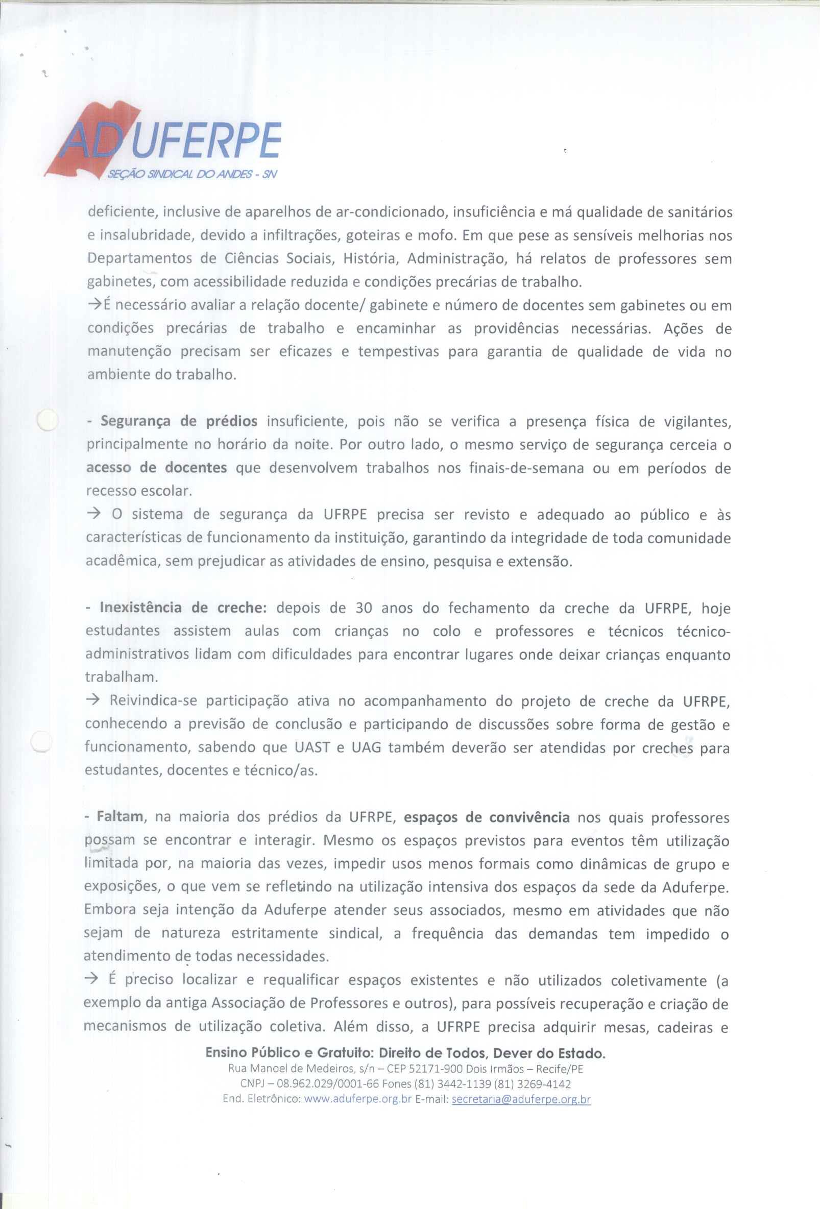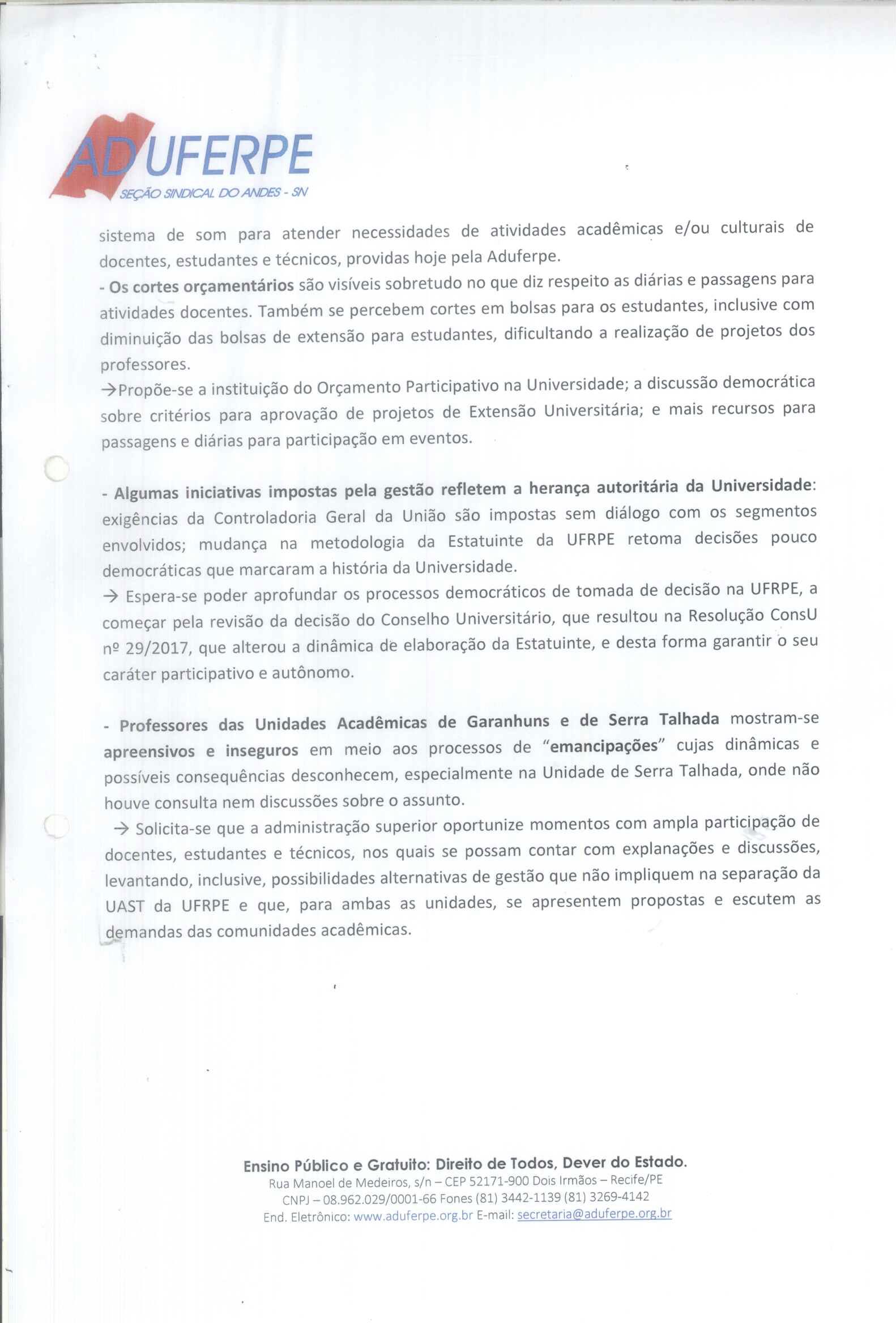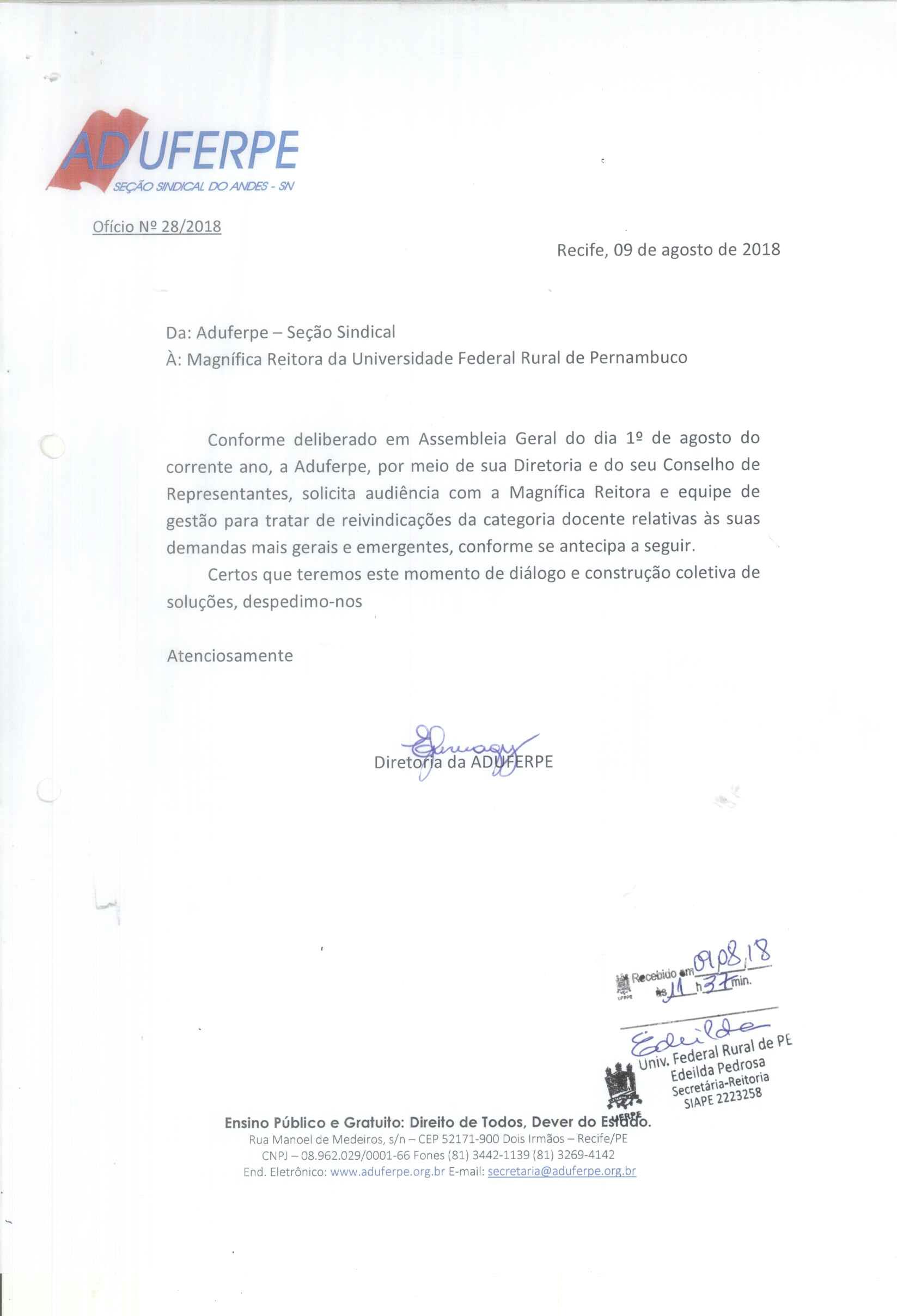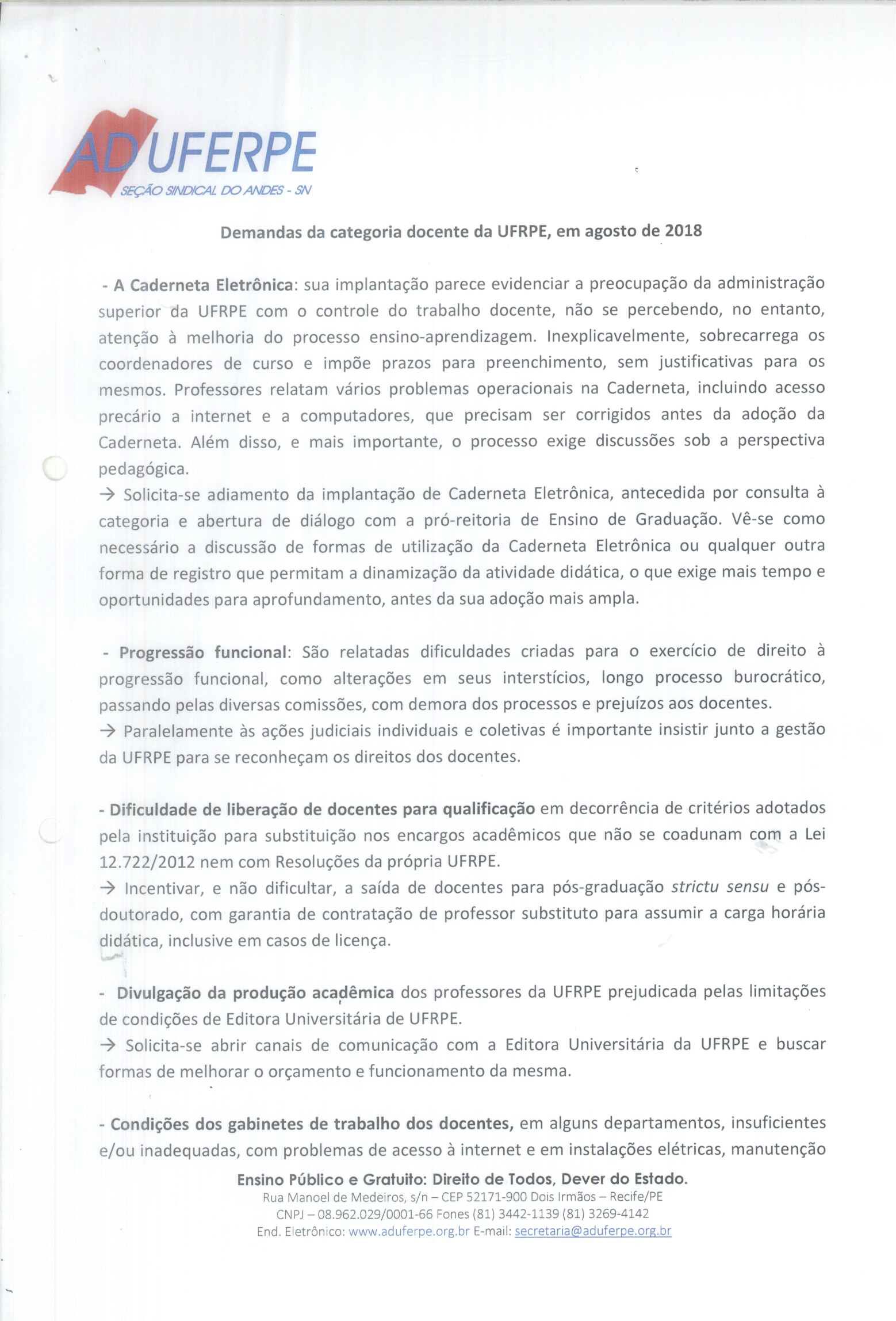 Conforme deliberação da última da assembleia, a Aduferpe protocolou, na manhã do dia 9 de agosto, documento na Reitoria com pautas urgentes de reivindicações da categoria docente. O documento, que integrou as mobilizações que antecederam o dia 10 Dia do Basta – ponto de pauta da Assembleia, foi construído de forma coletiva a partir de pautas do Conselho de Representantes e sistematizado pela diretoria da Aduferpe.