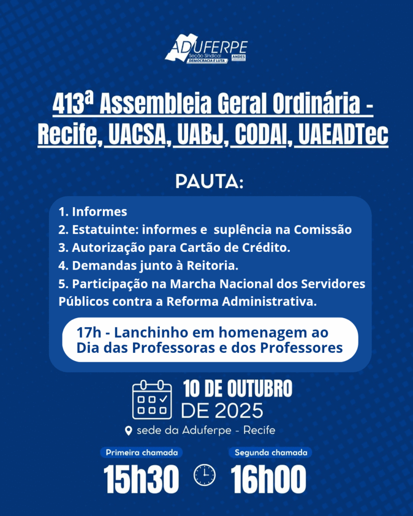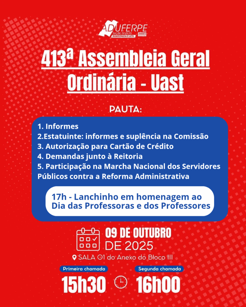 🗣 A Aduferpe convoca sua base para Assembleia Geral Ordinária, que vai discutir pautas importantes para categoria como a Estatuinte e Marcha Nacional dos Servidores Públicos Contra a Reforma Administrativa. Sua participação é fundamental para fortalecimento da nossa base e avanços nas pautas de reivindicações.