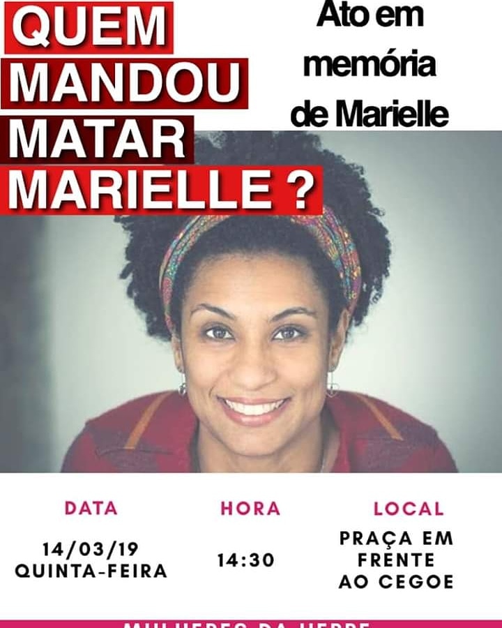 Um ano da execução de Marielle e Anderson. Convidamos todas e todos a participar do ato em memória do primeiro ano do assassinato de Marielle Franco a ocorrer na praça em frente ao Cegoe, nesta quinta (14), às 15h. Pela vida de todas as mulheres!