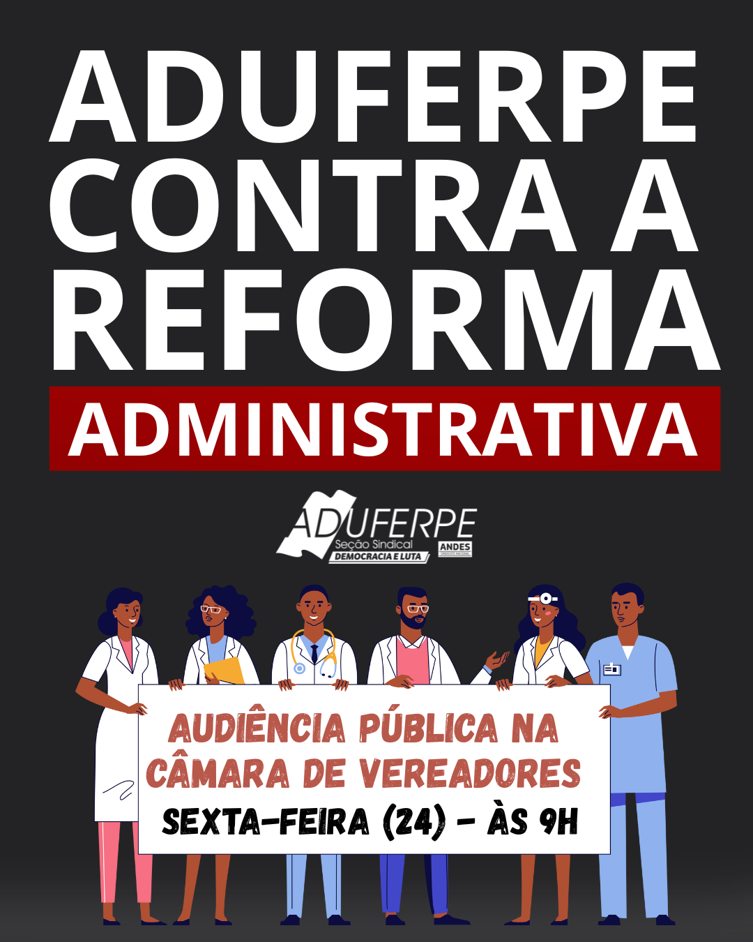 A Aduferpe convoca as professoras e os professores da UFRPE para Audiência Pública, nesta sexta-feira (24), às 9h, na Câmara de Vereadores, quando será discutida a Reforma Administrativa e os seus reflexos no desmonte dos serviços públicos.