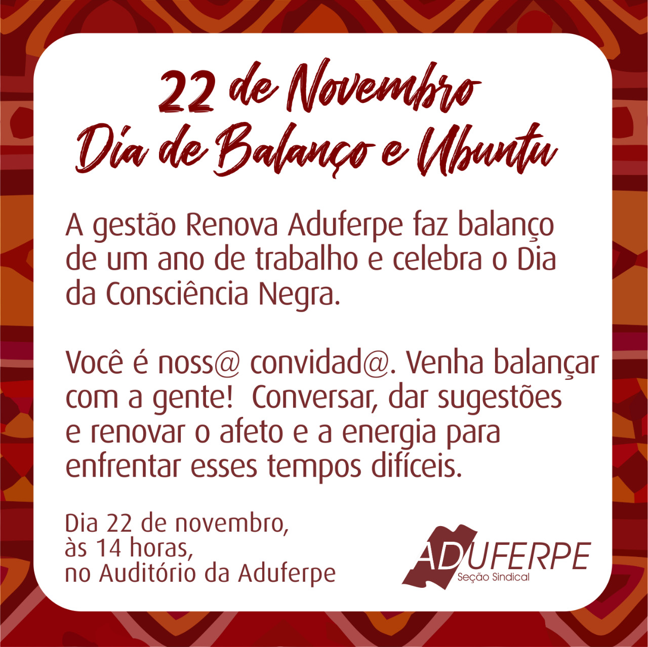 Venha balançar com a gente! A gestão Renova Aduferpe fará, nesta quinta-feira (22), o balanço de um ano das suas ações e também vai celebrar o Dia Nacional da Consciência Negra Ubuntu.