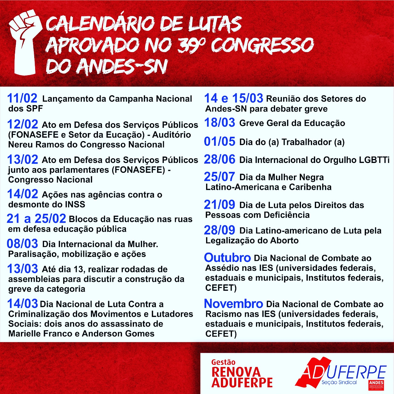 Se ligue no Calendário de Lutas aprovado no 39º Congresso do Andes-SN, entre os dias 4 e 8 deste mês, em São Paulo.