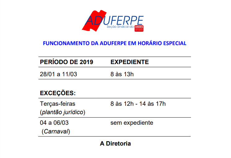 Comunicado aos/às filiados/as sobre horário especial de funcionamento da Aduferpe entre 28/01 e 11/03 Por Redação - 23 de janeiro de 2019 Prezados/as filiados/as, Informamos que, em virtude do recesso na UFRPE e da programação de férias de nossos funcionários, a Aduferpe funcionará em horário especial conforme a tabela abaixo: