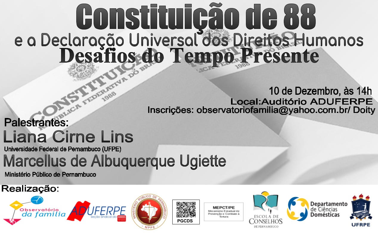 A Aduferpe, em parceria com outras entidades, estará realizando no dia 10 de dezembro, às 14h, em seu auditório, a palestra Constituição de 88 e a Declaração Universal dos Direitos Humanos: Desafios do Tempo Presente. O evento terá como palestrantes a professora da UFPE, Liana Cirne, promotor da MPPE, Marcellus Ugiette. As inscrições estão abertas no endereço observatoriofamilia@yahoo.com.br
