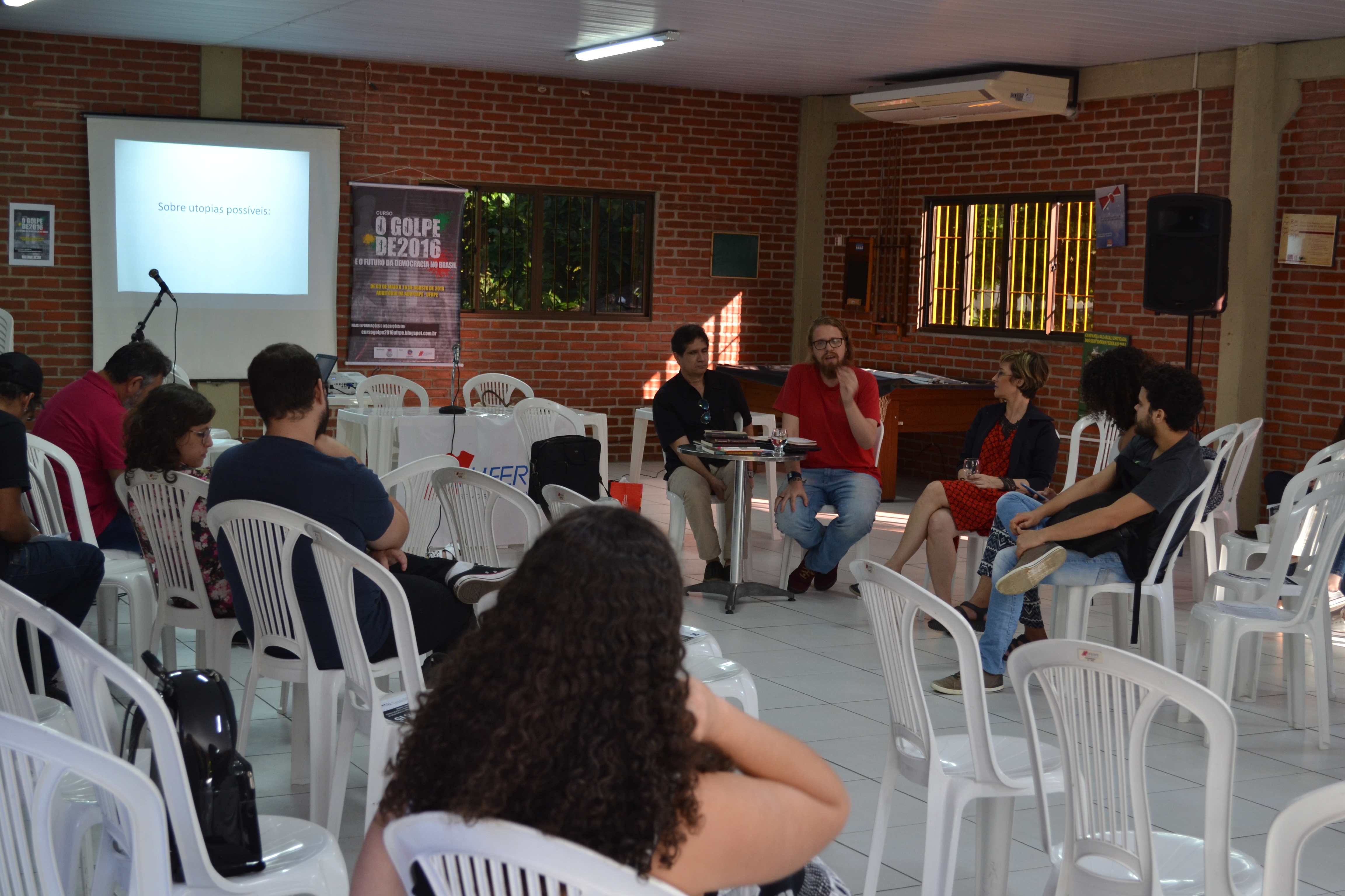 As características da democracia liberal no Brasil e no mundo, o esgotamento desse modelo e as utopias possíveis a partir de projetos coletivos foram algumas das discussões pautadas no 12º Encontro do curso O Golpe de 2016 e o Futuro da Democracia no Brasil, realizado no auditório da Aduferpe. A aula, sobre a temática O Futuro da Democracia no Brasil em Busca de Utopias Possíveis, foi ministrada pela professora da UFRPE, Lúcia Falcão, que trouxe como convidados o professor Artur Perrusi, da UFPE, e o doutorando Aloízio Barbosa, também da UFPE.