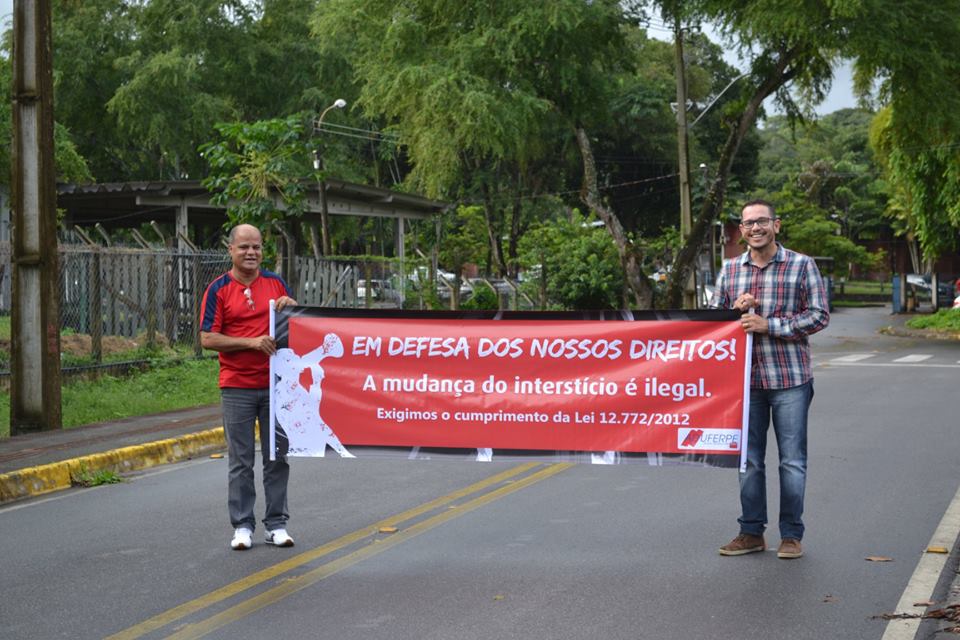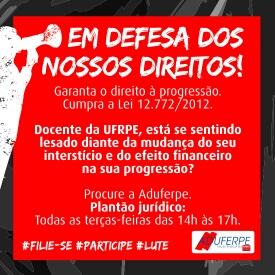 Em defesa dos direitos dos/as docentes, no que diz respeito à garantia das progressões e promoções funcionais previstas na lei 12.772/12, a direção da Aduferpe está realizando várias mobilizações para esclarecer os/as colegas professores/as da UFRPE sobre a mudança do interstício e do efeito financeiro na progressão, promovidos sem respaldo legal pela administração da universidade.