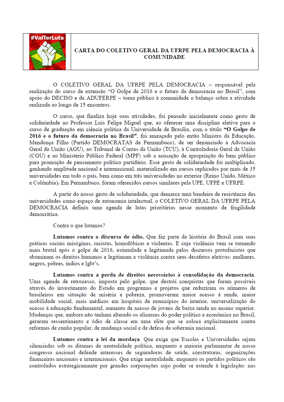 Segundo a professora do Departamento de História, Lúcia Falcão, a iniciativa, além do caráter de formação, foi um gesto de solidariedade ao professor Luis Felipe Miguel, da UnB, o primeiro no Brasil a ministrar uma disciplina sobre o Golpe de 2016, em março deste ano, e que por isso sofreu vários tipos de perseguições. Para a presidenta da Aduferpe, Erika Suruagy, os encontros trouxeram mais conhecimento para se entender melhor toda complexidade que está por trás do golpe. “Não existe soberania sem investimento em ciência, tecnologia e garantia da autonomia das universidades”, discursou Erika.