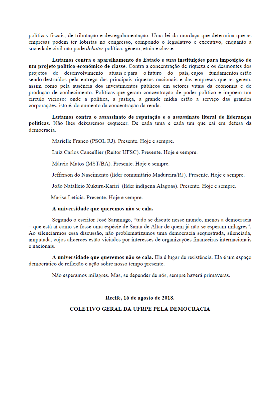 Após a Conferência, a professora Lúcia Falcão fez a leitura de duas cartas políticas do Coletivo Geral da UFRPE pela Democracia: uma destinada à comunidade sobre a importância e os desafios da realização do curso e outra ao ex-presidente Lula.