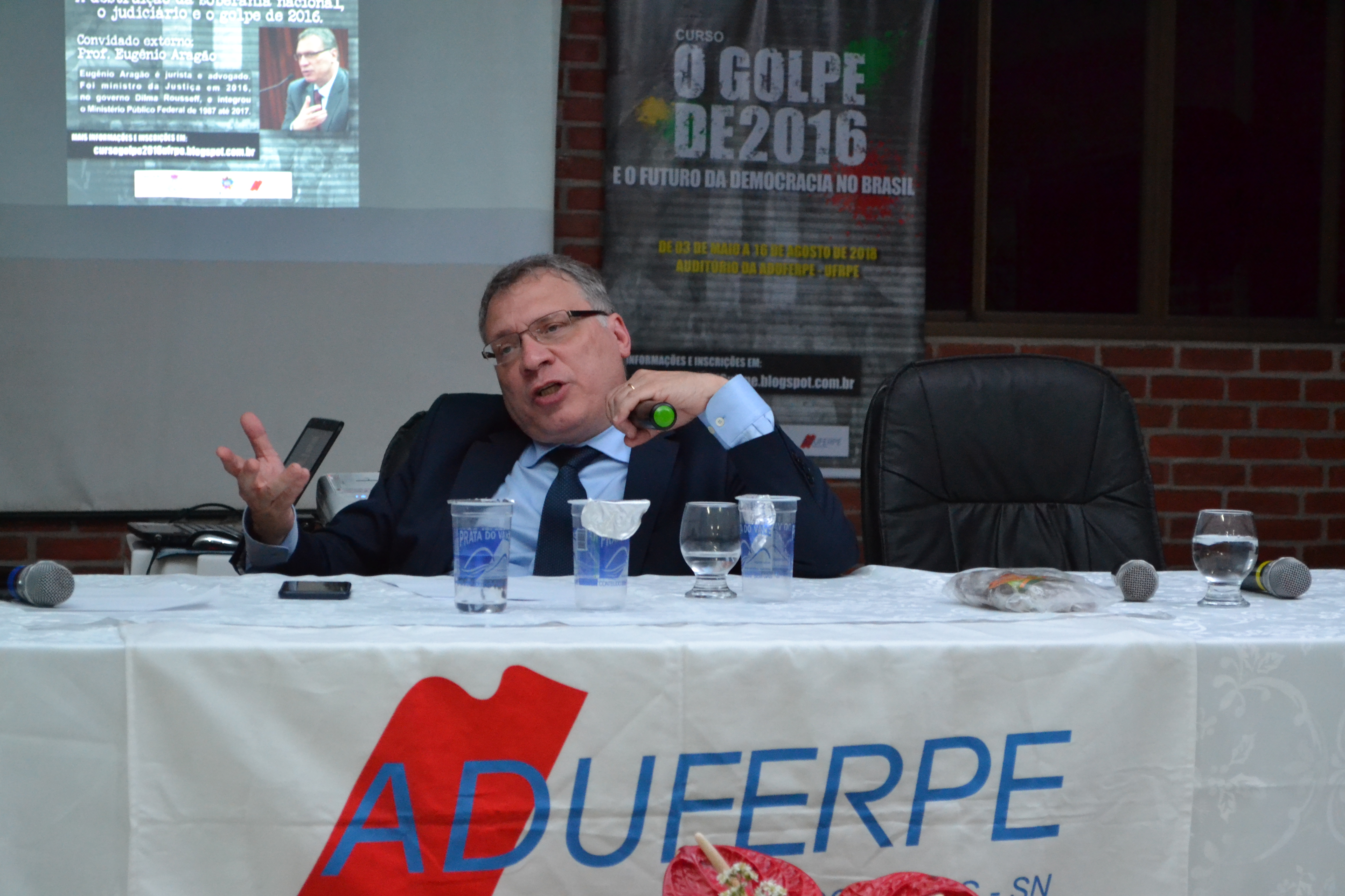 Com o objetivo de aprofundar as discussões sobre os diferentes aspectos que envolveram a construção do golpe de 2016, ainda em curso, o Departamento de Ciências Sociais da UFRPE (Deciso), com o apoio da Aduferpe, realizou O Curso O Golpe de 2016 e o Futuro da Democracia no Brasil. Formatado em 15 encontros, durante 3 meses, a última aula aconteceu na quinta-feira (16) com a Conferência do ex-ministro da Justiça e professor da Universidade de Brasília (UnB), Eugênio Aragão, sobre A Destruição da Soberania Nacional, o Judiciário e o Golpe de 2016. O curso contou com a participação de docentes de cinco departamentos da UFRPE, UFPE, Fundaj e de outras instituições e movimentos sociais.