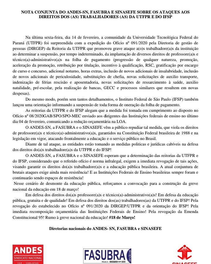 Nota Conjunta do ANDES-SN, FASUBRA E SINASEFE os ataques aos Direitos dos (as) Trabalhadores (as) da UTFPR e do IFSP Por Redação - 19 de fevereiro de 2020
