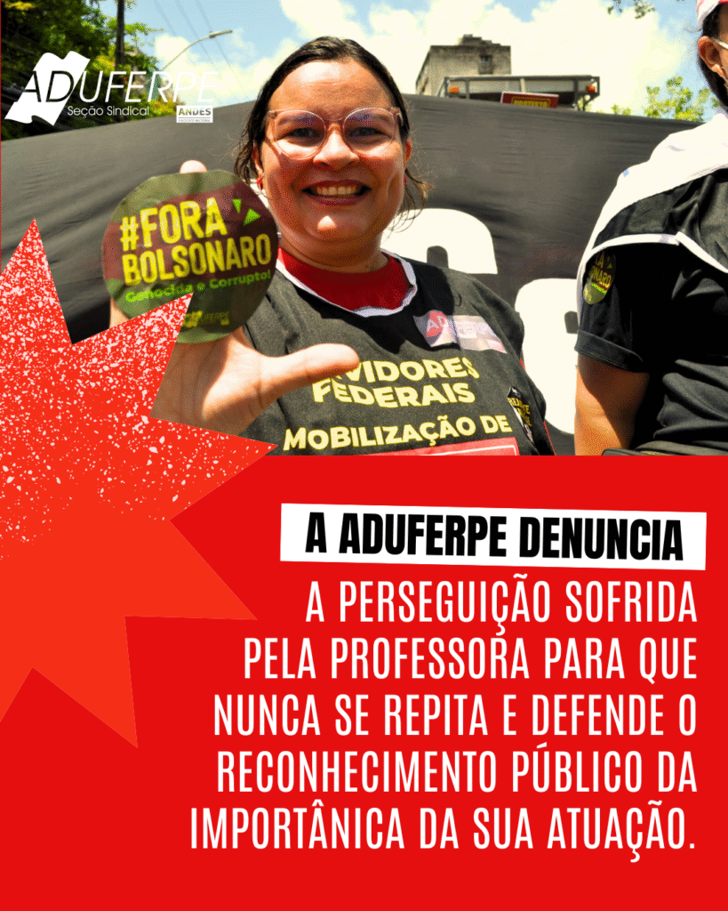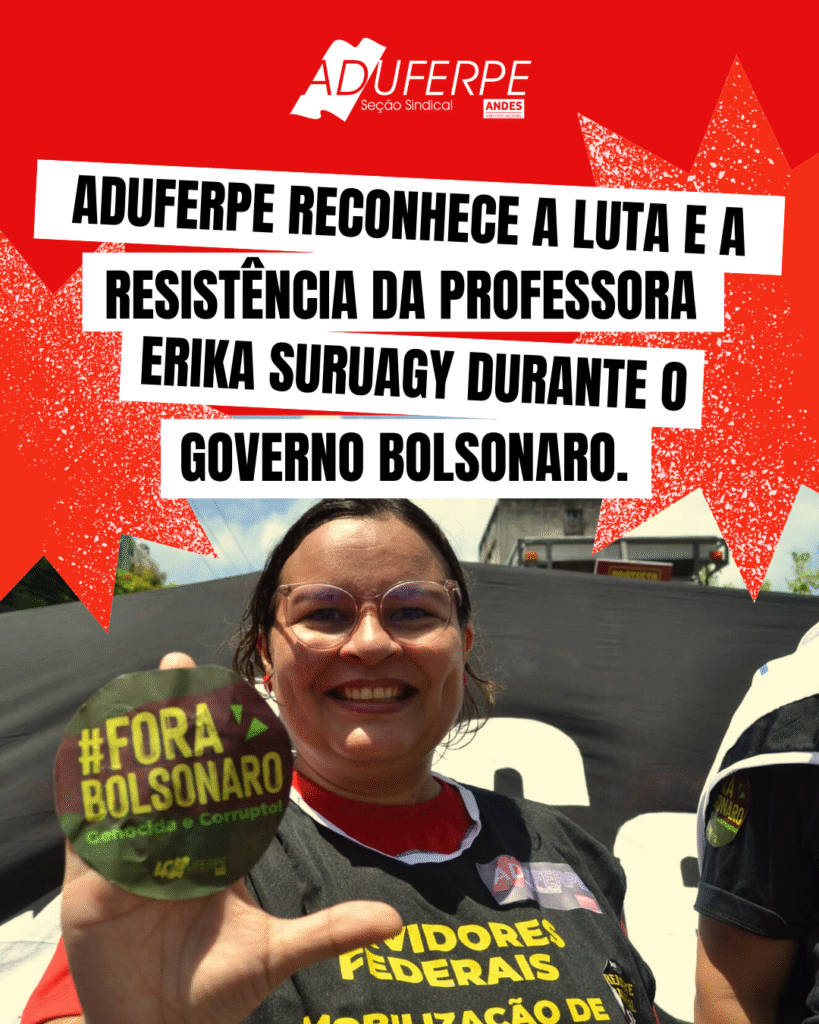 A Aduferpe, Seção Sindical do Andes que congrega docentes da Universidade Federal Rural de Pernambuco, externa seu reconhecimento à luta e à brava resistência da professora Erika Suruagy, ex-presidenta da Aduferpe, no enfrentamento de intimidações, ameaças, perseguição política e processo judicial forjados e impetrados pelo ex-presidente da República, Jair Bolsonaro, e a cúpula do seu governo. Reconhecemos publicamente sua atuação assertiva e combativa enquanto liderança sindical ao colocar-se criticamente em manifestações públicas no contexto da pandemia da Covid-19, frente ao descaso da gestão Bolsonaro com a saúde do povo brasileiro, as universidades, as políticas públicas, os direitos humanos, a ciência e a educação.