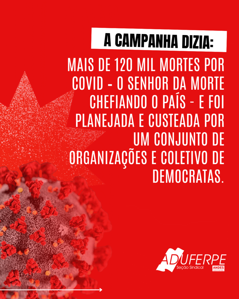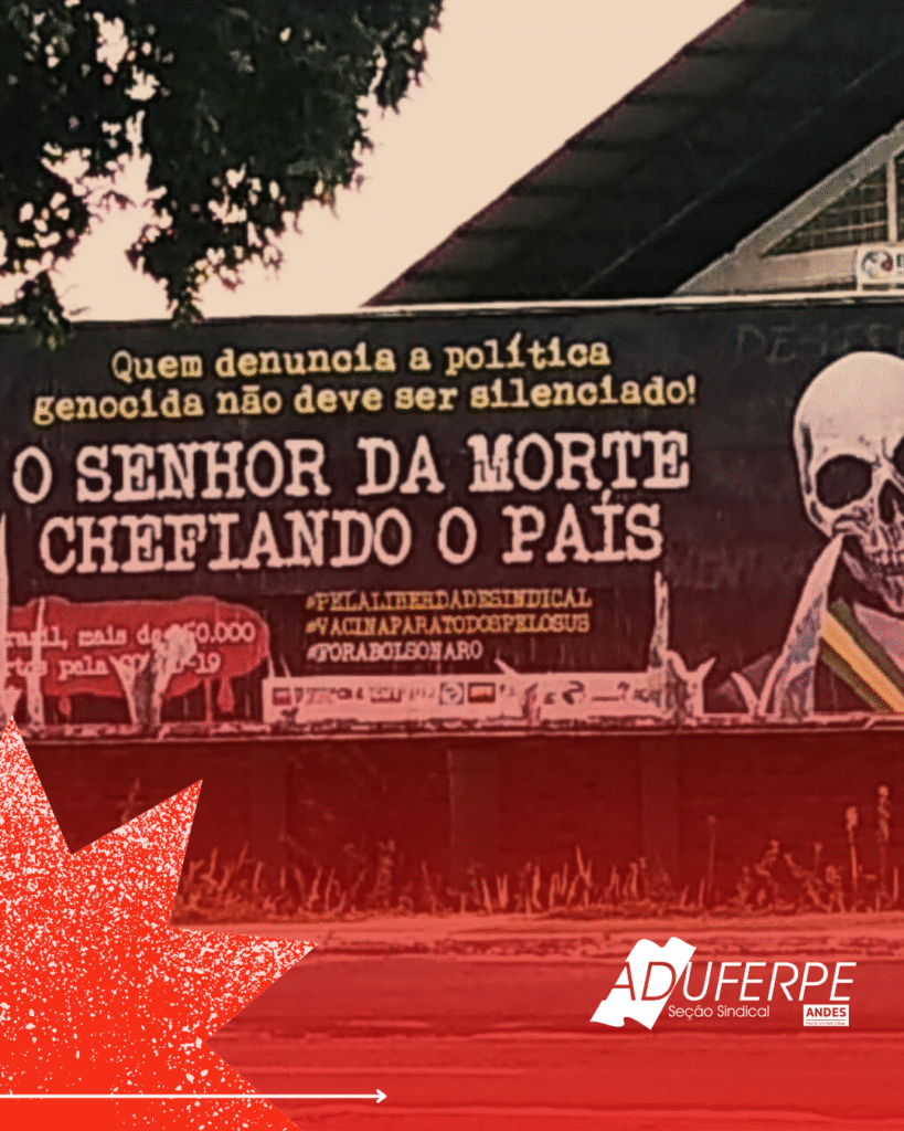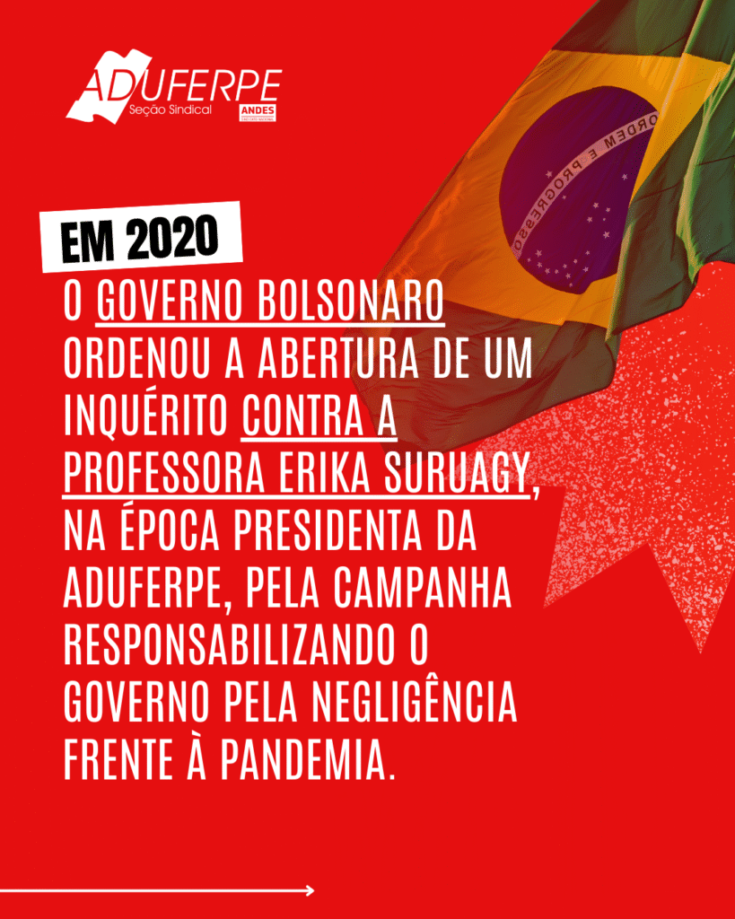 Em um primeiro momento, após manifestações e campanhas publicitárias em defesa da vida e da educação, nas quais a professora Erika Suruagy atuou como representante da Aduferpe e como partícipe do grupo Amigos da Democracia, coletivo de docentes e militantes em defesa da democracia, a perseguição se materializou em inquérito aberto pela Polícia Federal, sob a demanda direta do gabinete da Presidência da República, para proceder a oitivas e investigação pela colocação de outdoors relacionados às mortes por Covid-19, que assolavam o país naquele momento. A campanha se deu em vários bairros da cidade do Recife e outras cidades pernambucanas, no final de 2020, utilizando outdoors com uma imagem caricatural representando a morte, e a seguinte frase: O Senhor da Morte Chefiando o País: No Brasil, mais de 120 mil mortes por COVID-19. #ForaBolsonaro.