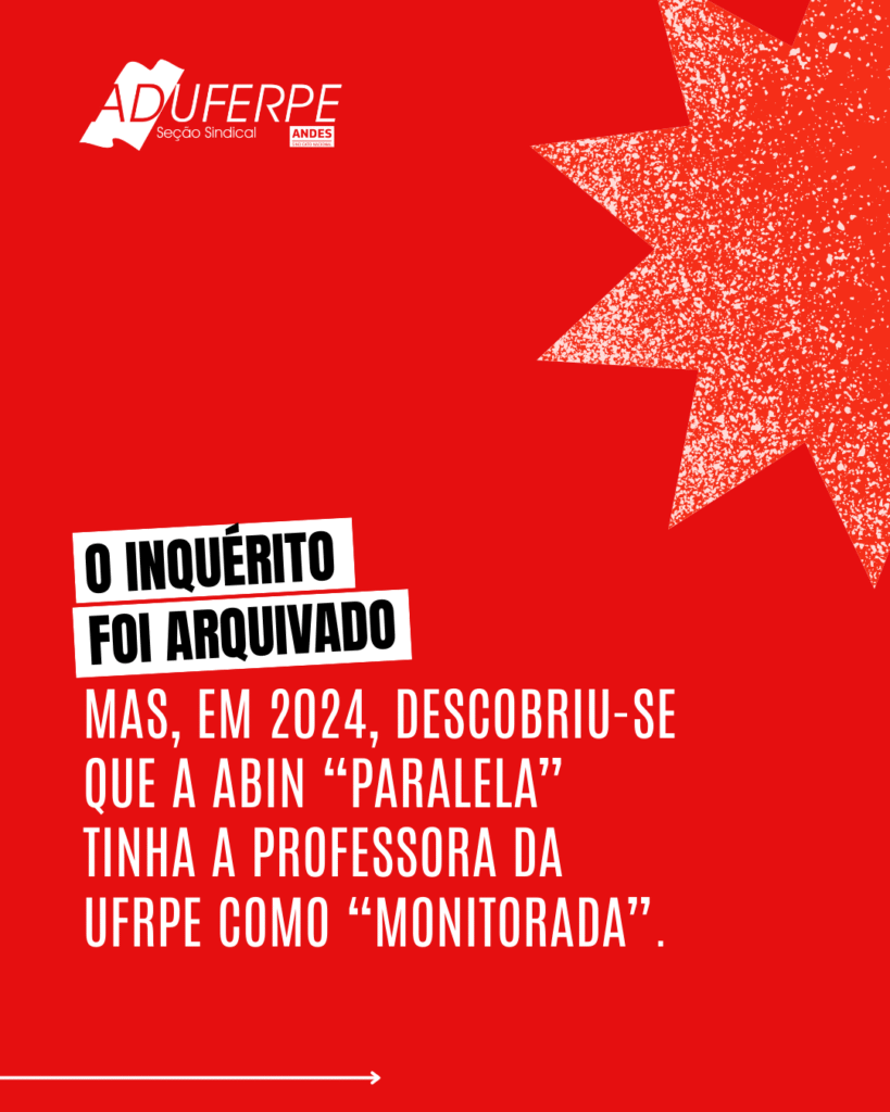 Em recente relatório do Supremo Tribunal Federal sobre a atuação da Abin “paralela” na perseguição e investigação secreta de indivíduos, entidades e instituições que defendiam a democracia contra os ataques do governo de Jair Bolsonaro, ficou comprovada, mais uma vez, a atuação intimidatória das forças antidemocráticas contra a professora Erika Suruagy. Seu nome aparece citado na lista de vigilância, como indivíduo a ser monitorado por ser alvo de inquérito devido a críticas ao então presidente. Cabe lembrar que a Aduferpe e a professora Erika Suruagy combateram os ataques do governo Bolsonaro desde os primeiros dias, seja denunciando os cortes nos orçamentos, enfrentando tentativas de censura em salas de aulas e espaços virtuais, como também enfrentando a perseguição política e a nomeação de reitores não eleitos pela comunidade universitária.
