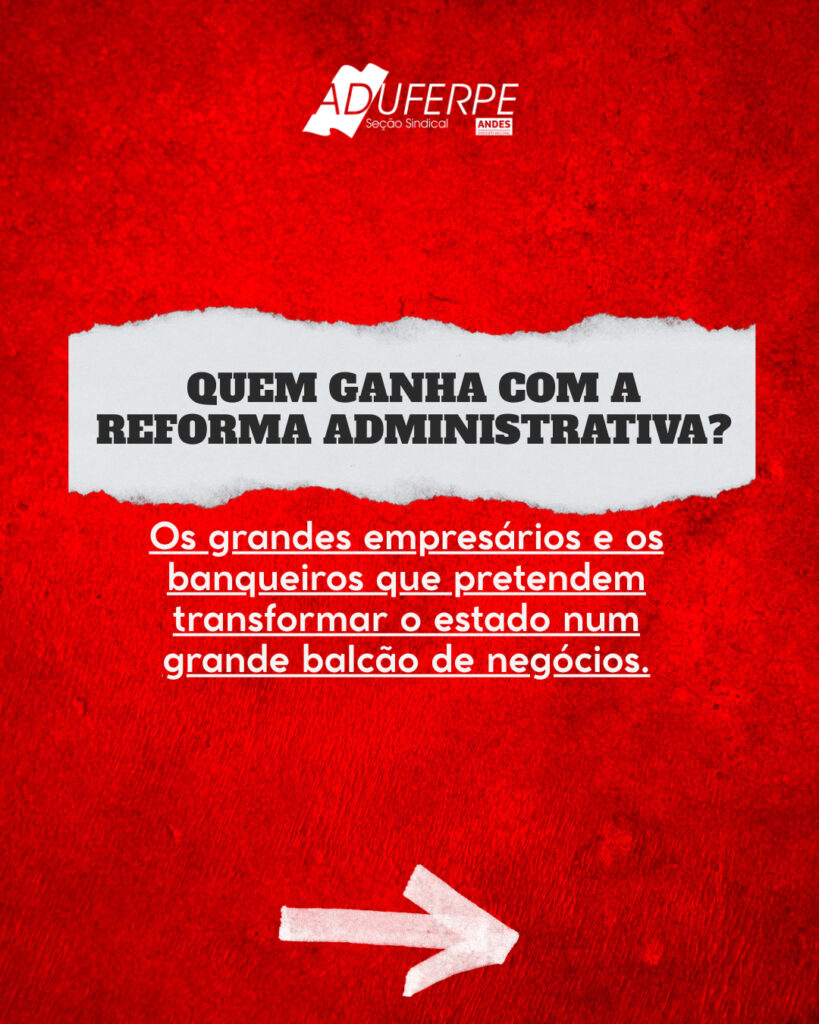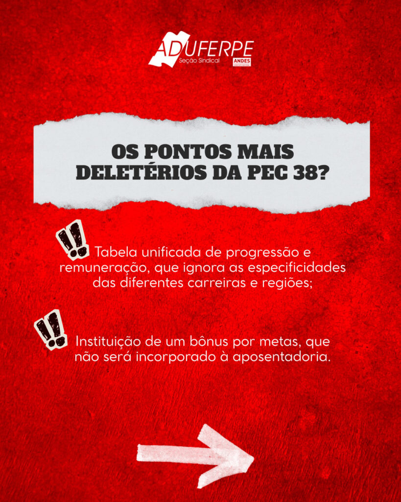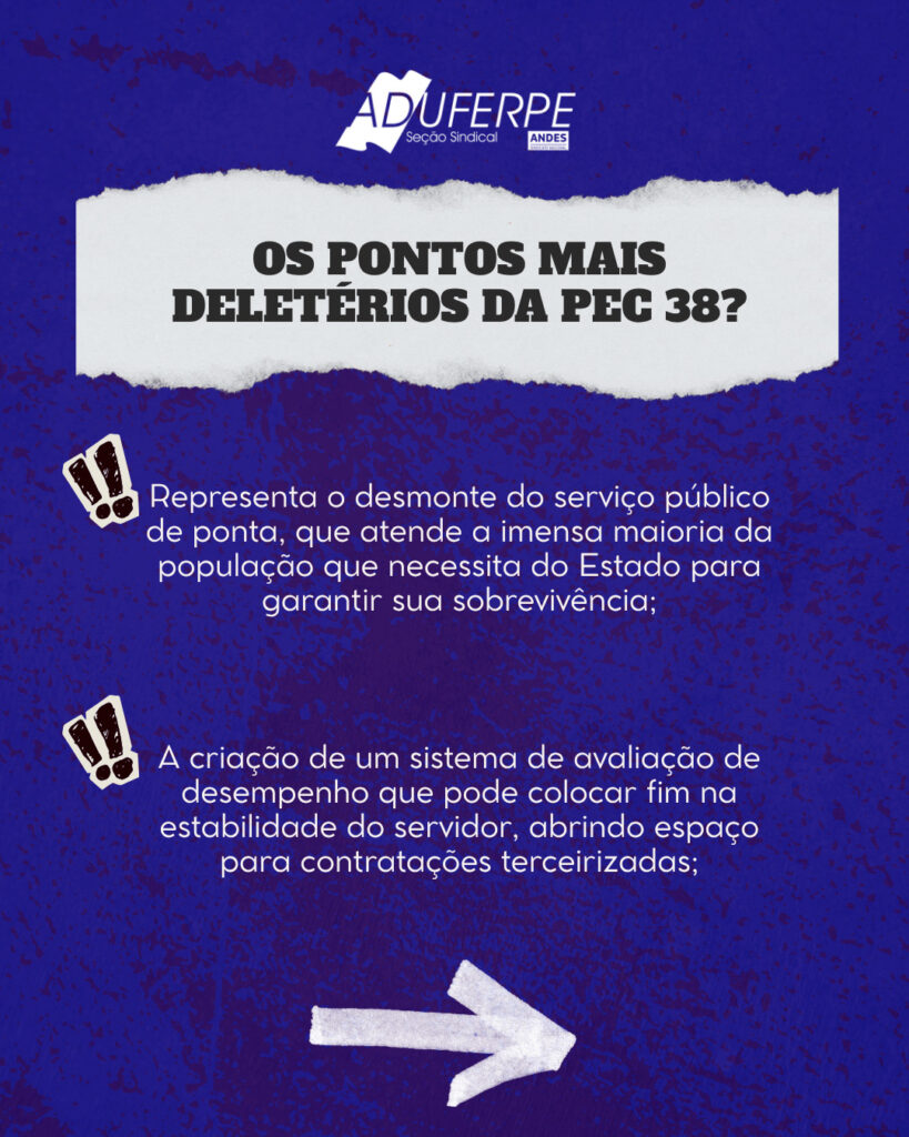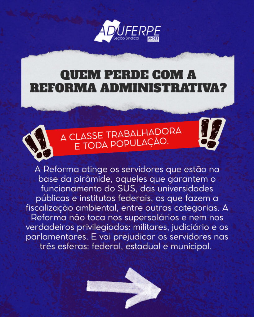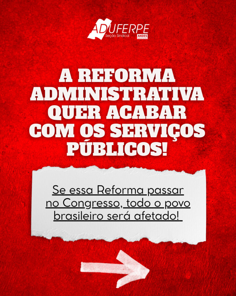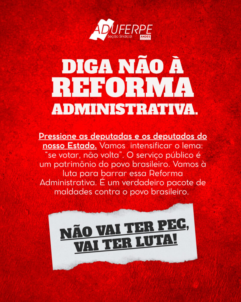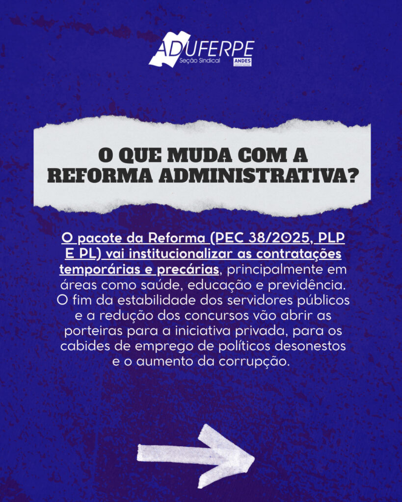 ✊🏾 A Aduferpe destaca a importância da categoria docente se engajar na luta para barrar a Reforma Administrativa, PEC 38/2025, que tem a finalidade de fazer um desmonte do serviço publico, trazendo graves prejuízos aos servidores públicos e à população em geral.
