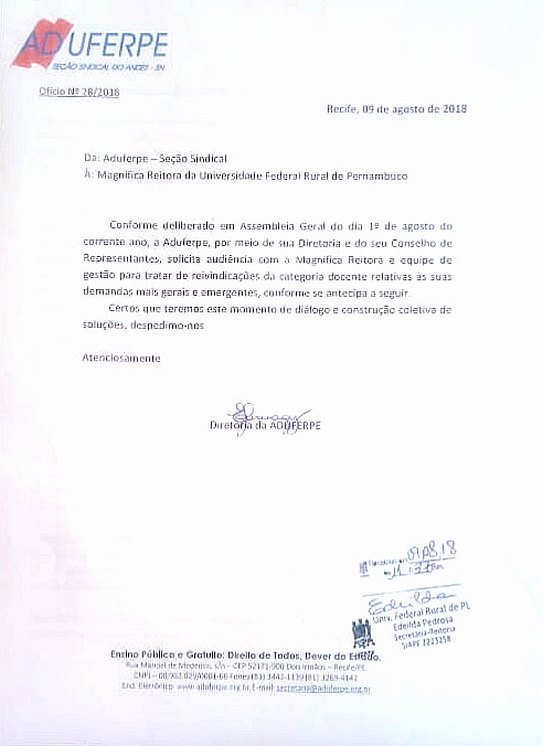 O ofício da Aduferpe solicitando audiência para discutir a pauta foi protocolado no dia 9 de agosto e foi resultado de deliberação de Assembleia. A data mais próxima oferecida pela reitoria para receber os representantes da categoria foi o dia 3 de outubro, agendada após cobrança da Aduferpe. A demora na abertura ao diálogo pode comprometer o andamento de questões de grande relevância, cujas respostas não se pode mais esperar.