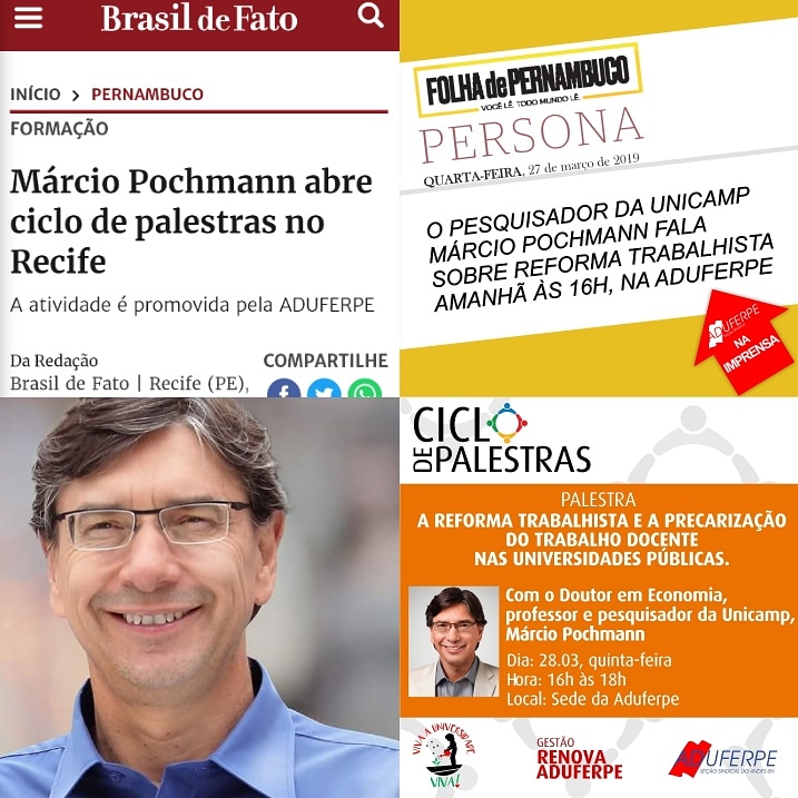 É nesta quinta-feira (28), às 16h, na Aduferpe. O Ciclo de Palestras da Aduferpe tem início com o professor, economista e pesquisador da Unicamp, Márcio Pochmann, que vai falar sobre A Reforma Trabalhista e a Precarização do Trabalho Docente na Universidade Pública.