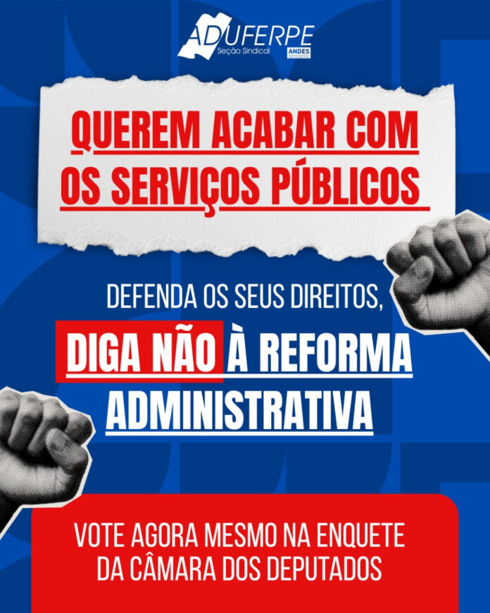 Vote contra a Reforma Administrativa agora Por Redação - 29 de outubro de 2025 🔊 A Câmara dos Deputados abriu enquete sobre a PEC 38/2025, da Reforma Administrativa. Vamos dizer NÃO ao fim dos serviços públicos. Quando for votar, escolha a opção DISCORDO TOTALMENTE VOTE AQUI